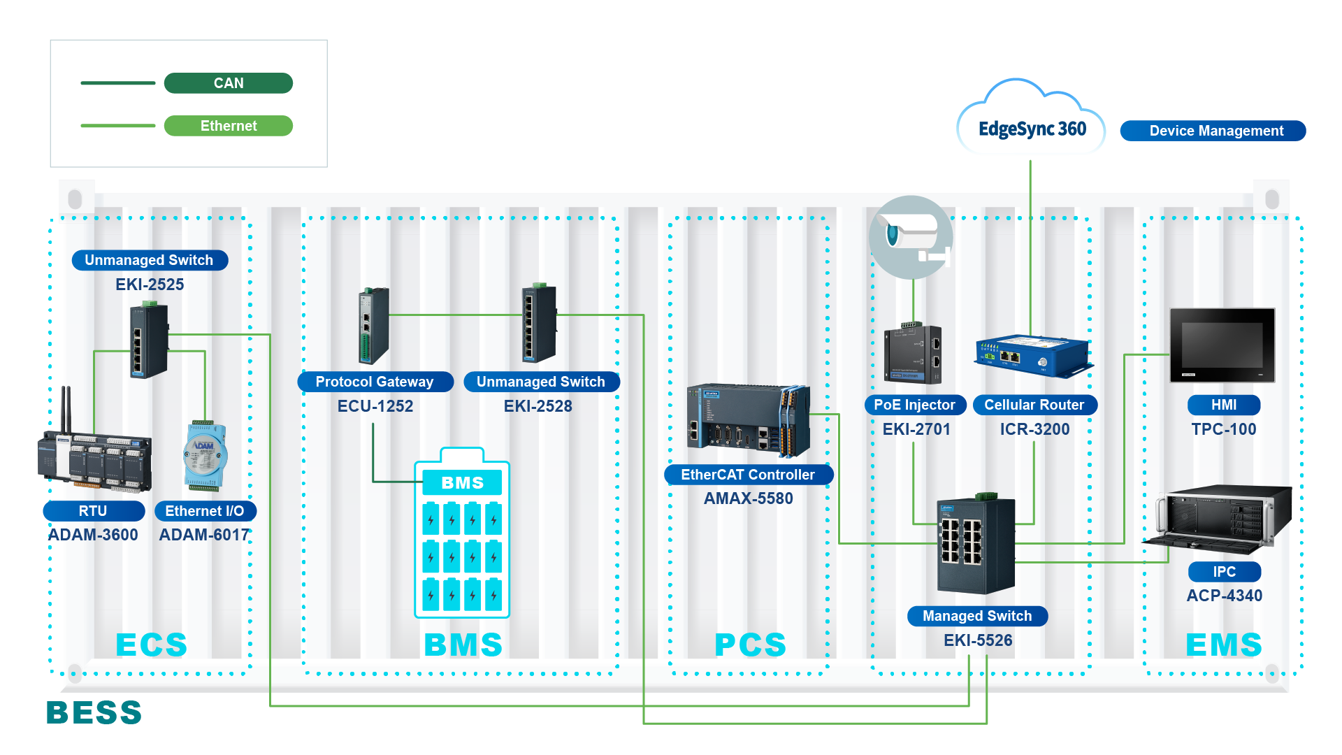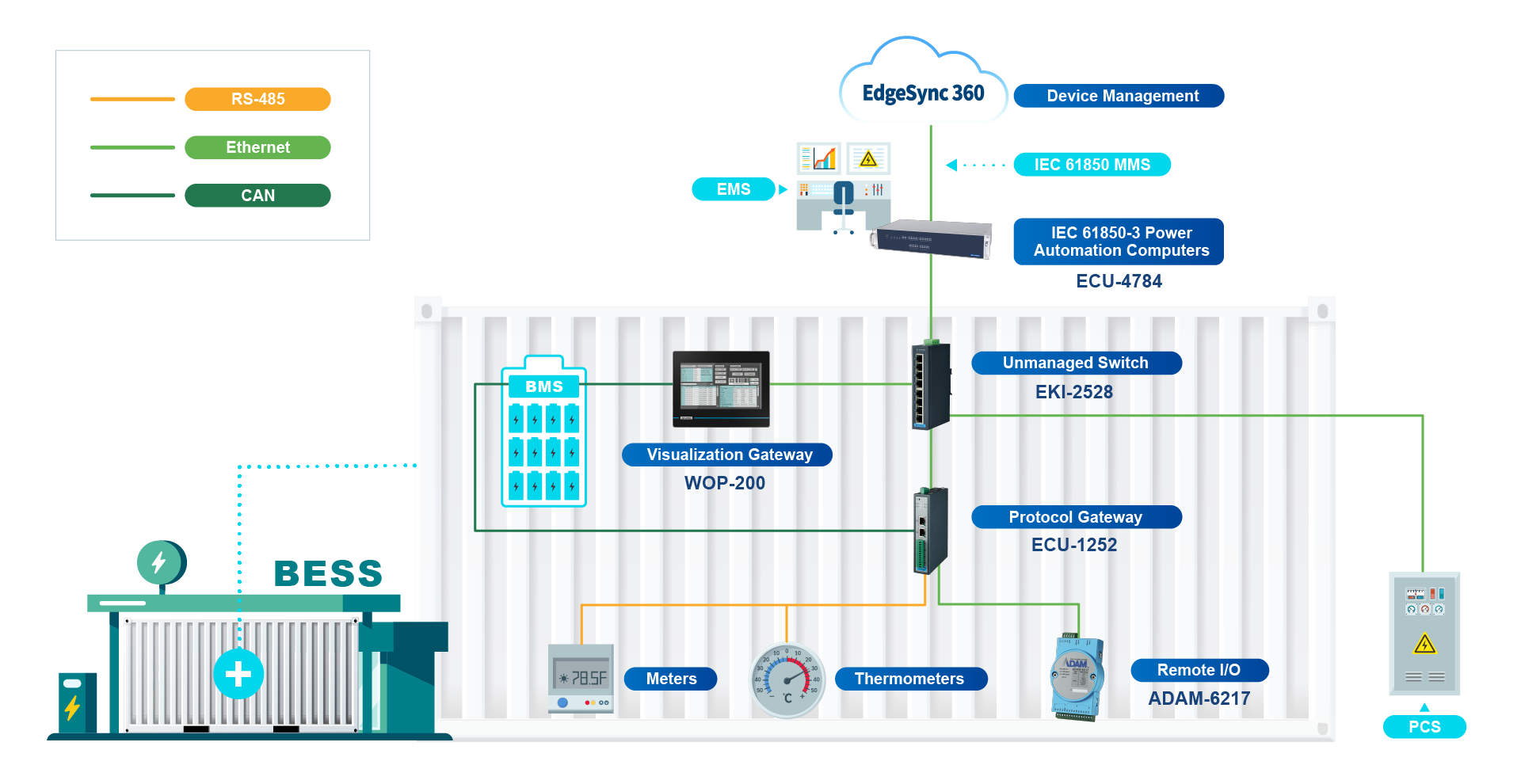 W praktyce systemy BESS integrują wiele różnych urządzeń oraz protokołów komunikacyjnych. W instalacjach energetycznych powszechnie wykorzystywane są protokoły takie jak Modbus, CANbus, IEC 61850 czy DNP3. Aby umożliwić integrację urządzeń różnych producentów, stosuje się przemysłowe bramy protokołów takie jak ECU-1251D czy ECU-150. Z kolei moduły komunikacyjne jak ADAM-6000 umożliwiają wymianę danych pomiędzy systemami energetycznymi, urządzeniami automatyki oraz platformami informatycznymi. Dane z systemu BESS mogą być przesyłane zarówno do lokalnych systemów sterowania, jak i do platform chmurowych, gdzie są analizowane w celu optymalizacji pracy instalacji.