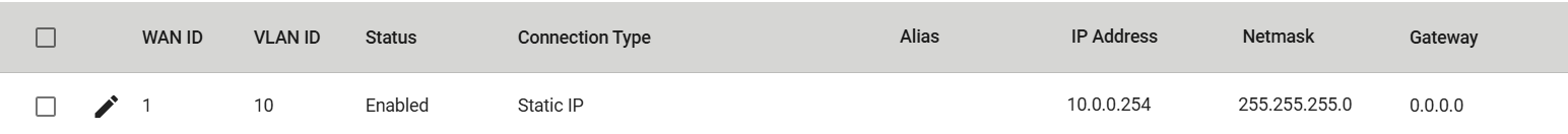 Następnie na wcześniej skonfigurowanym VLANie 10 tworzony jest interfejs WAN z adresem IP 10.0.0.254/24.