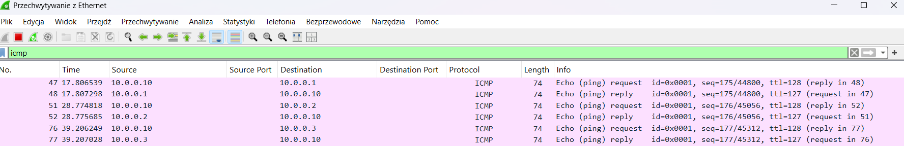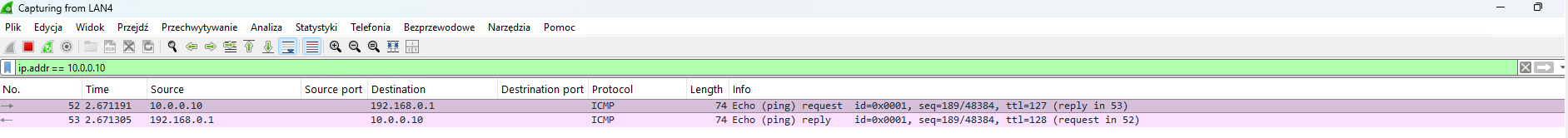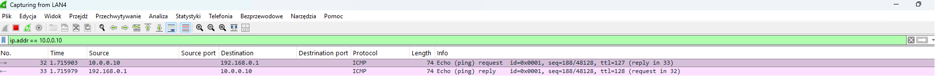 Aby potwierdzić poprawność konfiguracji, wystarczy wykonać prosty test za pomocą komendy ping. Poniżej zamieszczamy jego wynik.