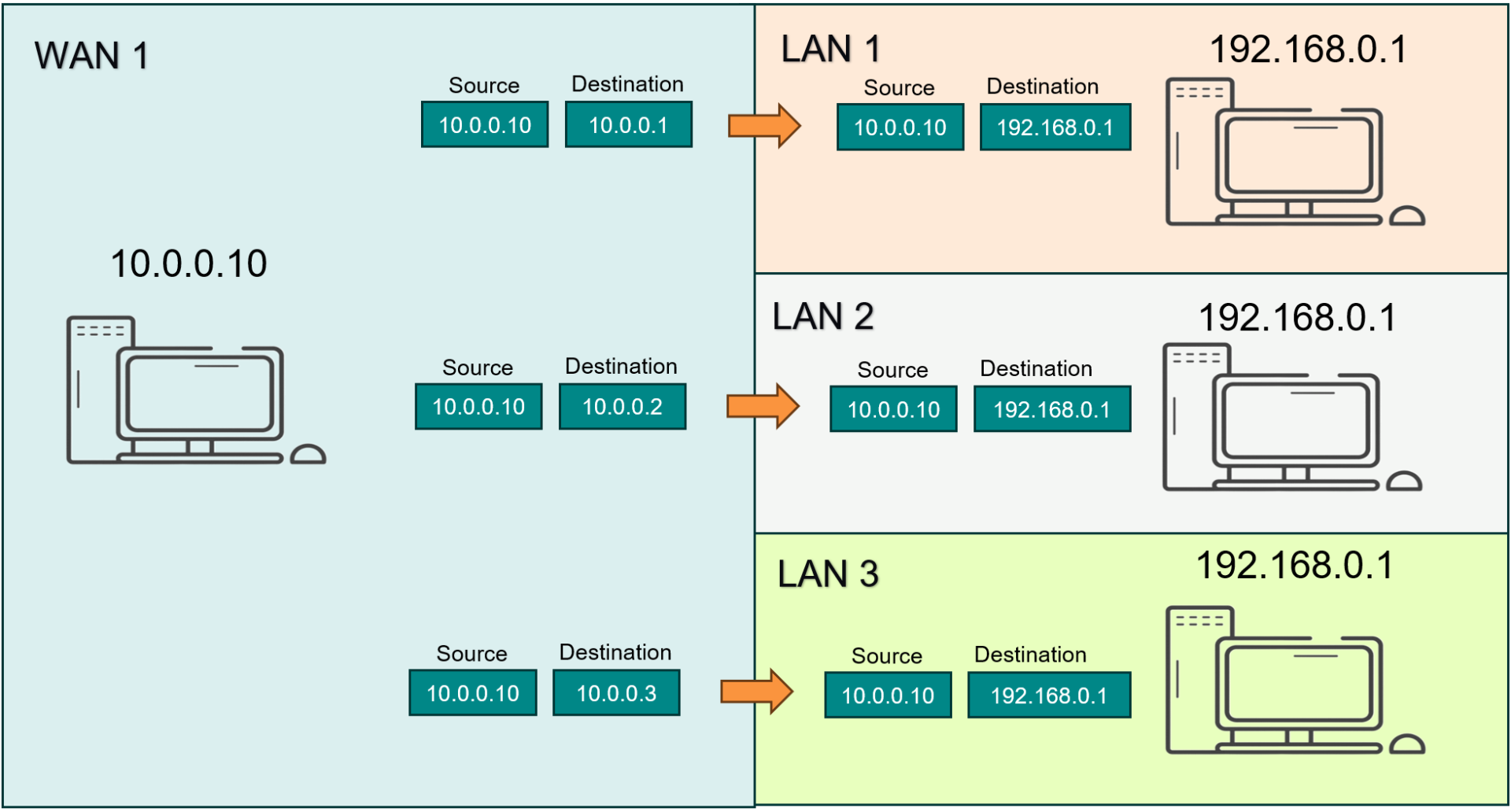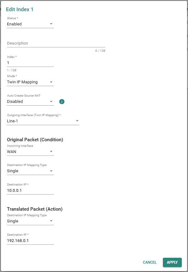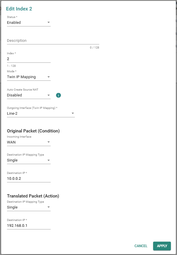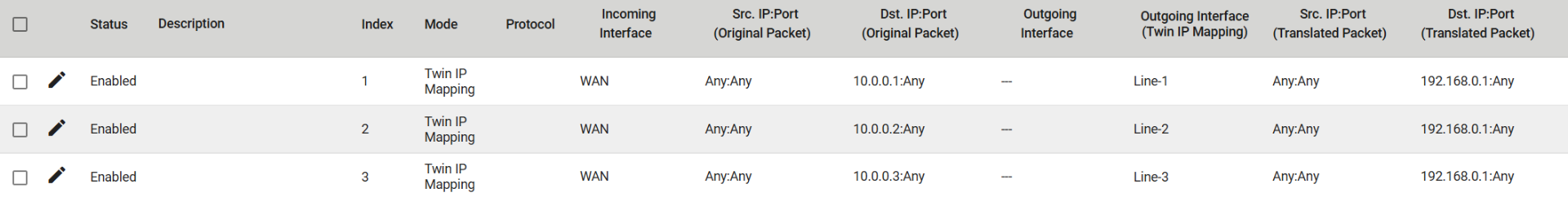 Warto zaznaczyć, że NAT-108 pozwala na równoczesne działanie maksymalnie trzech reguł IP Twins Mapping. Tryb ten wymaga, aby urządzenia końcowe obsługiwały konfigurację bramy domyślnej i nie umożliwia bezpośredniej komunikacji pomiędzy segmentami z tą samą adresacją (np. LAN1–LAN2).