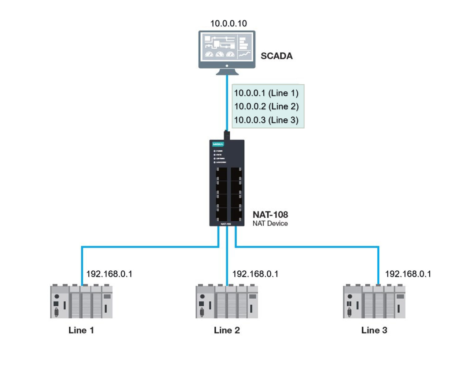 W tym podpunkcie przedstawimy konfigurację typowego scenariusza dla IP Twins Mapping. Połączymy system nadrzędny SCADA z trzema liniami produkcyjnymi, które wykorzystują identyczną adresację. Celem konfiguracji będzie umożliwienie nawiązania komunikacji systemu SCADA z urządzeniami w każdej linii, bez konieczności zmiany adresów IP po stronie sieci produkcyjnych.