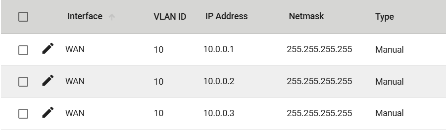 Aby NAT-108 mógł poprawnie rozpoznawać i obsługiwać przetłumaczony ruch, konieczne jest dodanie Secondary IP po stronie interfejsu WAN. Są to adresy, na które będzie kierowana komunikacja z systemu SCADA. W przedstawionym przykładzie należy dodać trzy adresy: