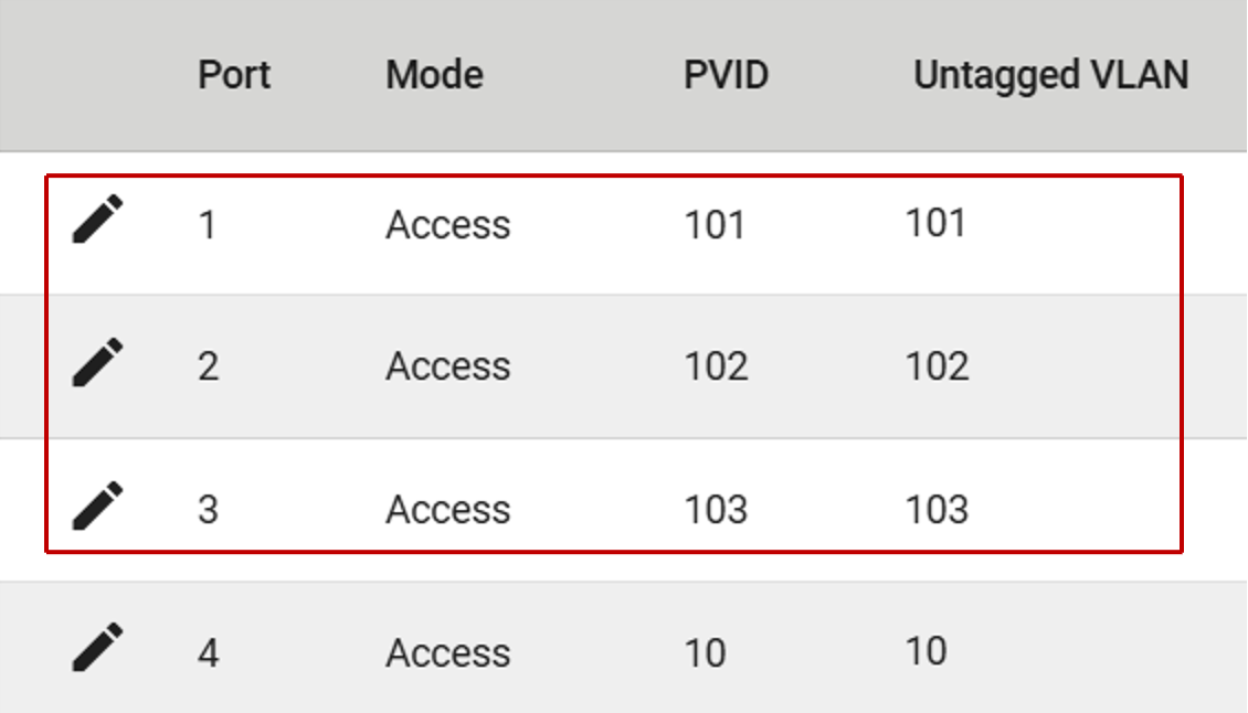 Dla każdej linii produkcyjnej tworzymy osobny VLAN i przypisujemy go do odpowiedniego portu w trybie Access. W przykładzie linie produkcyjne zostały przypisane do VLAN 101, 102 i 103, odpowiednio na portach 1–3.