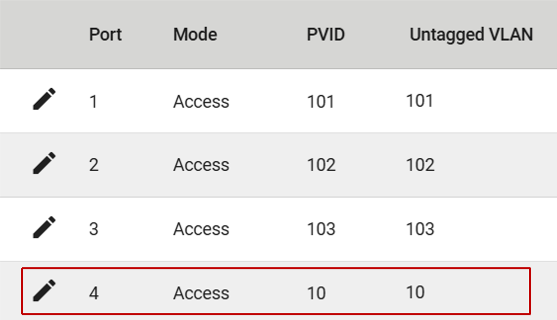 Pierwszym krokiem jest stworzenie dedykowanego VLANu dla systemu SCADA i przypisanie go do odpowiedniego portu. W omawianym scenariuszu wykorzystano VLAN 10 na porcie 4 w trybie Access.