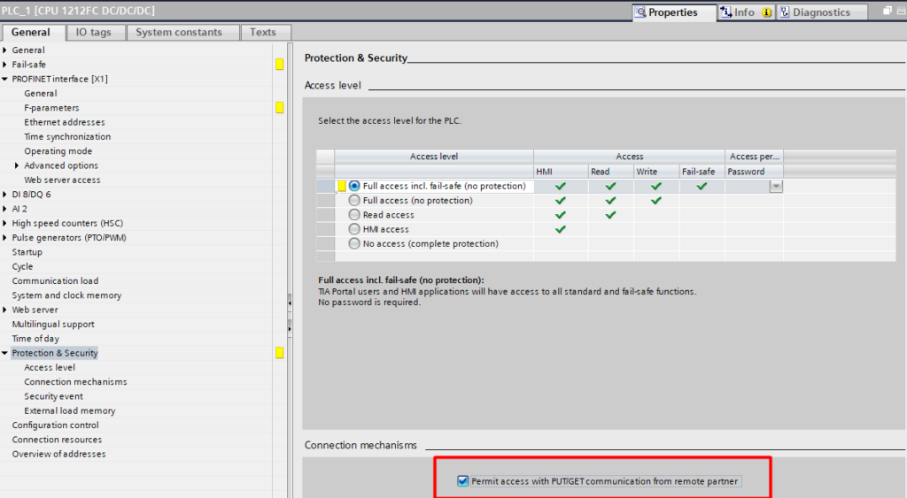 W zakładce "Protection & Security" należy zaznaczyć checkbox "Permit access with PUT/GET communication from remote partner".