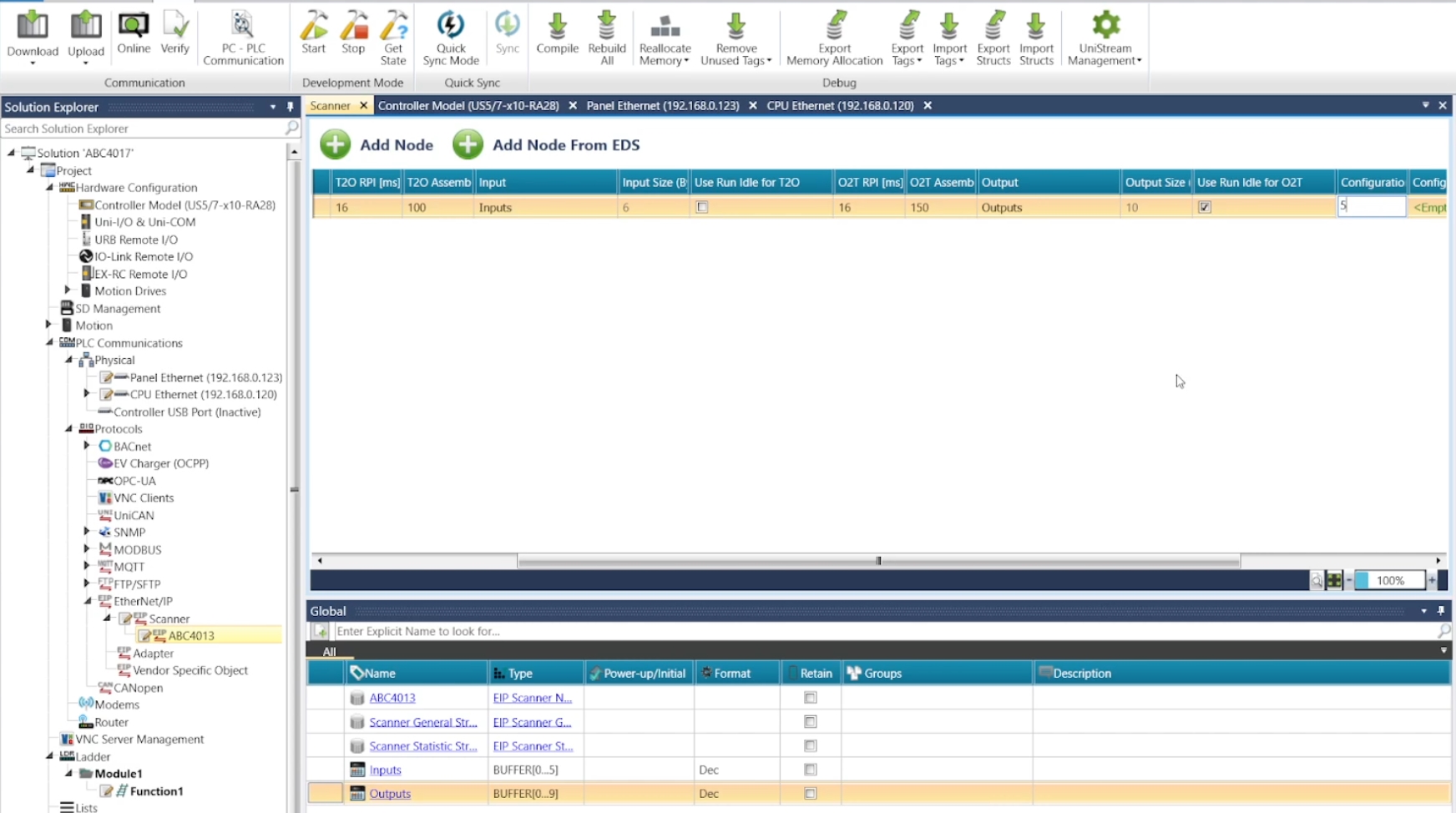 W przeglądarce wybieramy kolejną zakładkę z drzewa projektu po lewej stronie Ethernet/IP.