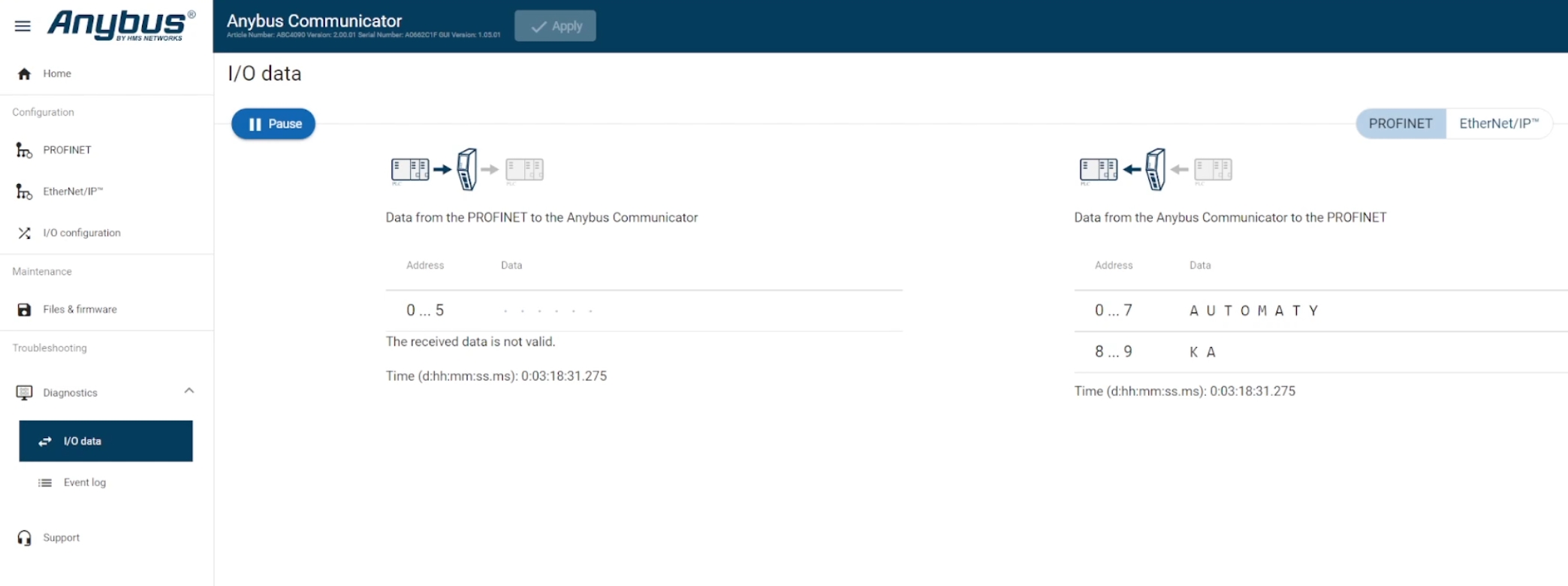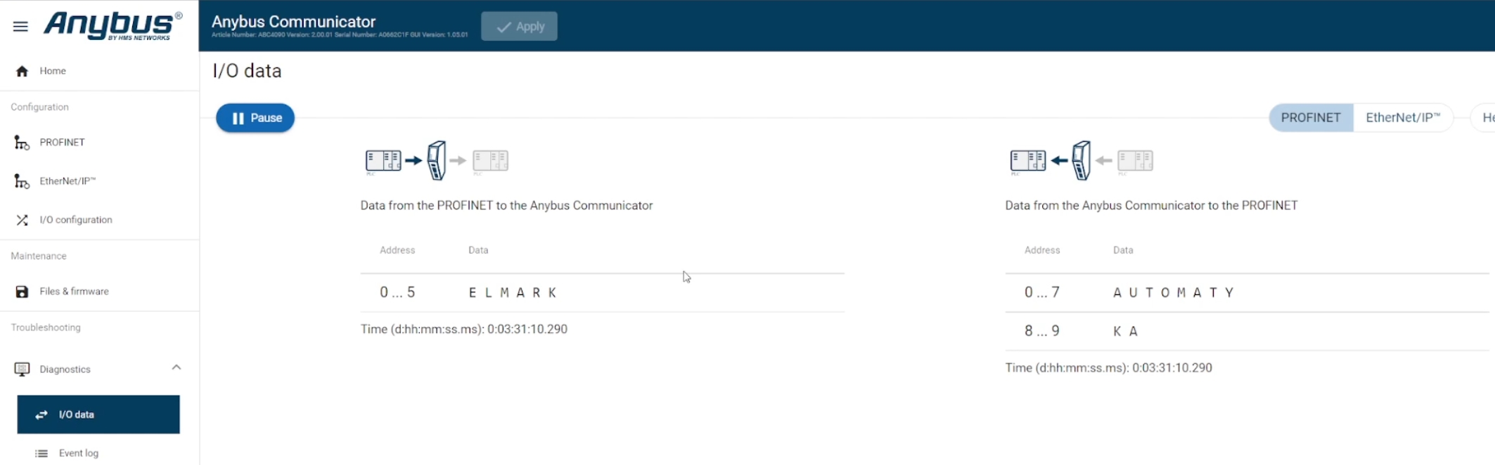 Po wybraniu odpowiedniej liczby bajtów wejściowych (10) oraz wyjściowych (6) można zweryfikować, że dane z EthernetIP Scanner'a są natychmiast widoczne po stronie PROFINET: