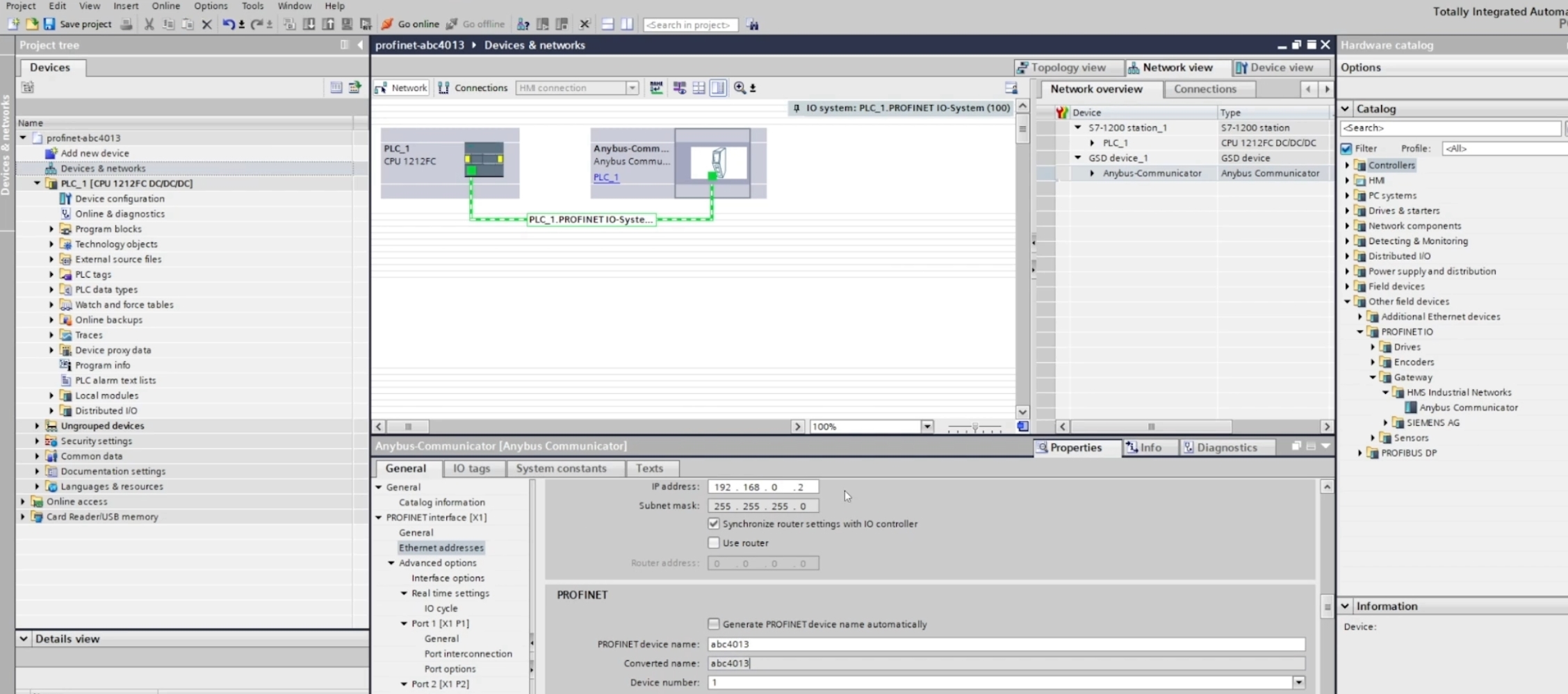 Używając pliku GSDML pobranego z bramy ABC4013, wprowadzając jej adres IP oraz nazwę „Station name”.