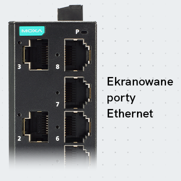 - Ekranowane porty Ethernet chronią transmisję danych przed zakłóceniami elektromagnetycznymi. Zapewniają stabilną i bezpieczną komunikację w sieciach przemysłowych.