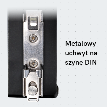 - Metalowy uchwyt na szynę DIN zapewnia szybki i solidny montaż w szafach sterowniczych. Gwarantuje odporność na drgania i wstrząsy w wymagającym środowisku przemysłowym.