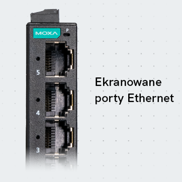 - Ekranowane porty Ethernet chronią transmisję danych przed zakłóceniami elektromagnetycznymi. Zapewniają stabilną i bezpieczną komunikację w sieciach przemysłowych.