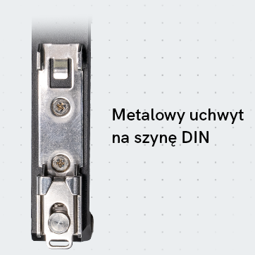 - Metalowy uchwyt na szynę DIN zapewnia szybki i solidny montaż w szafach sterowniczych. Gwarantuje odporność na drgania i wstrząsy w wymagającym środowisku przemysłowym.