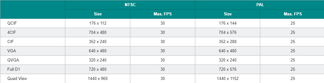 | Strumienie video | Podwójny strumień dla każdego kanału lub jeden poczwórny strumień (tzw. quad view) |