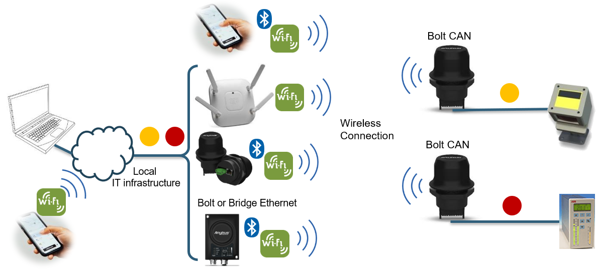 Anybus Wireless Bolt CAN umożliwia podłączenie maszyn i urządzeń przemysłowych do sieci bezprzewodowej. Może być montowany do szafki lub urządzenia, aby umożliwić bezprzewodowy dostęp przez Bluetooth® lub Wi-Fi (bezprzewodowa sieć LAN). Konwertuje dane CAN do/z komunikacji TCP/IP przez łącze bezprzewodowe.