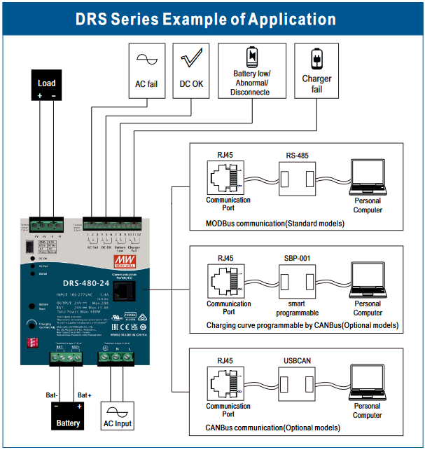 - DRS-480: seria zasilaczy 480W z wyjściem ładowania akumulatora (zobacz szczegóły)