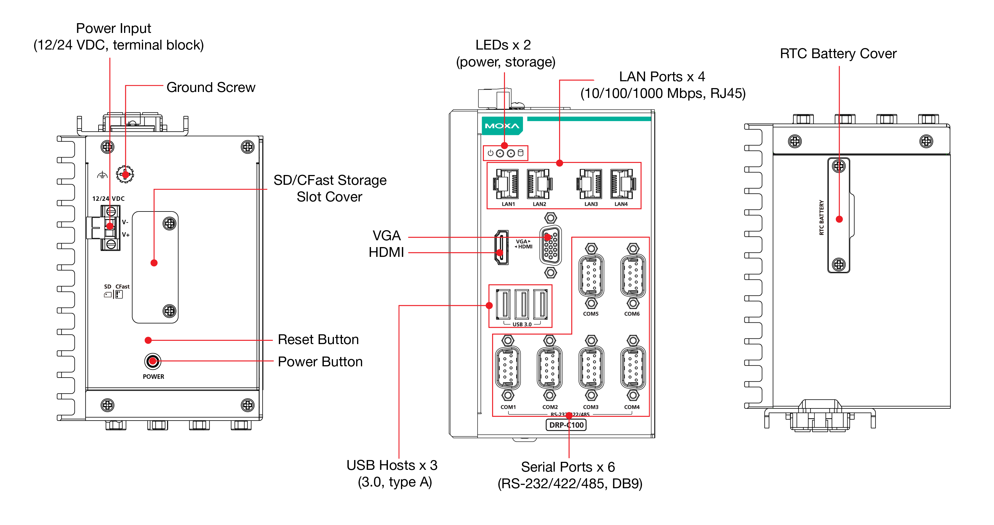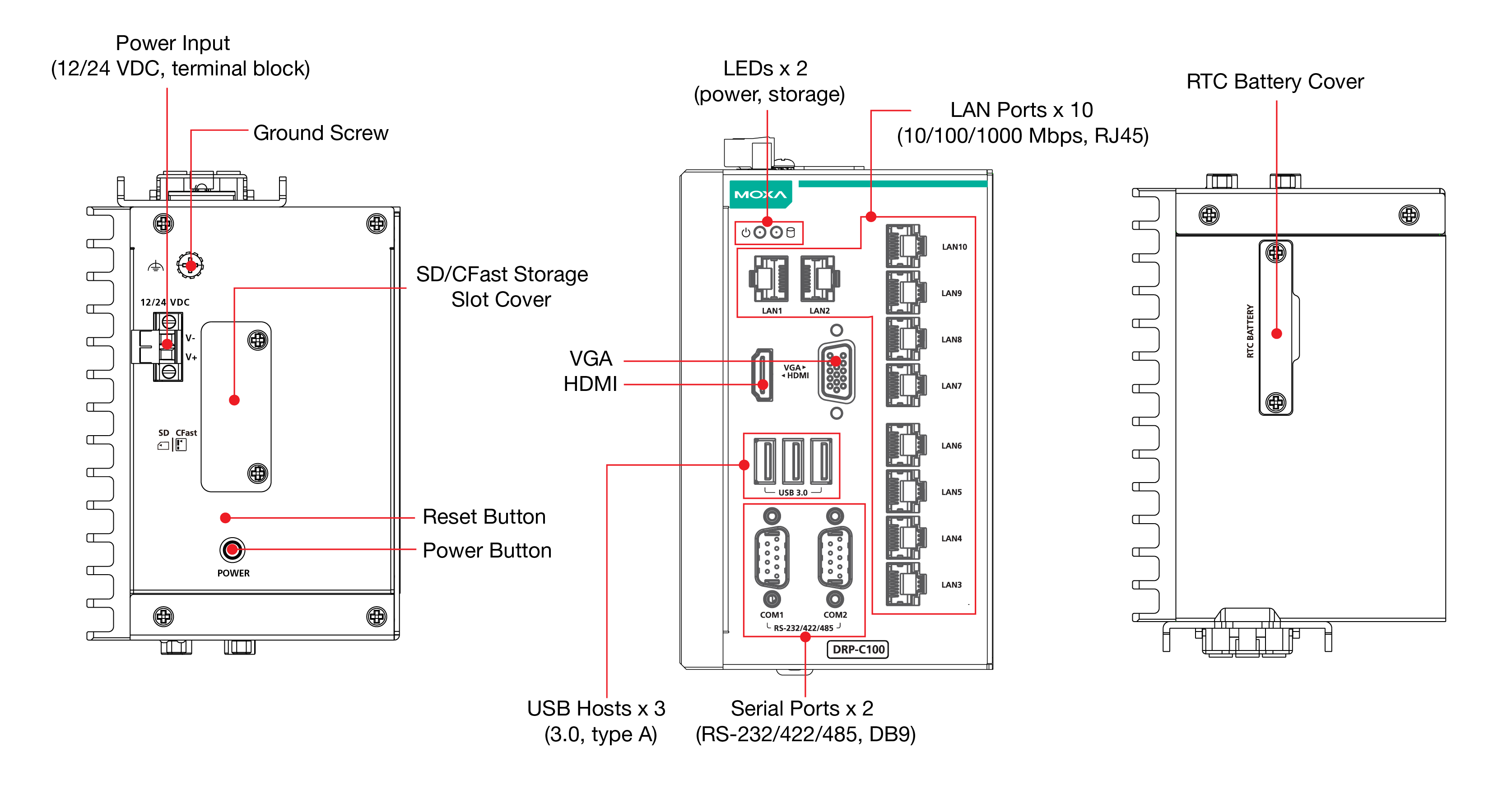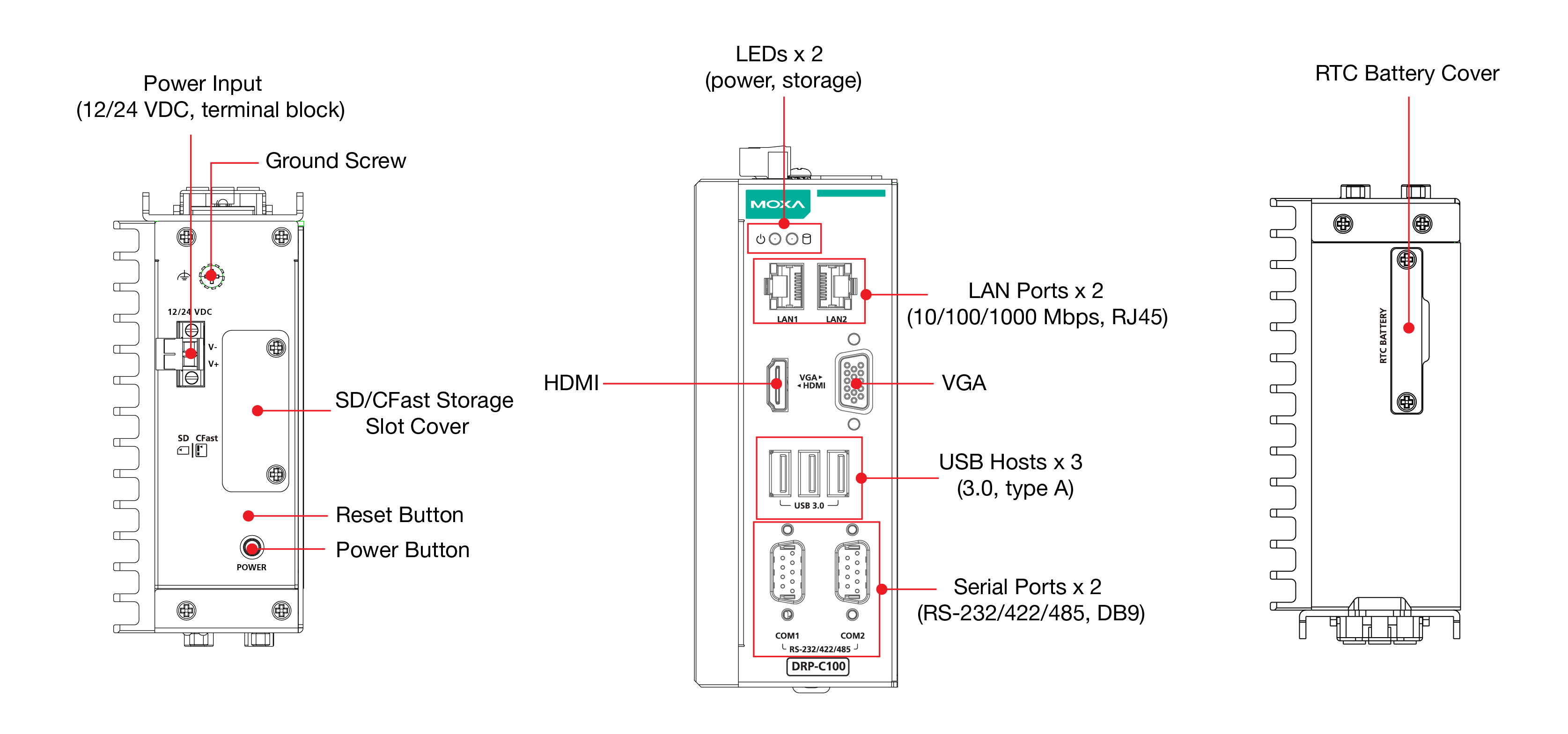 DRP-C100 Komputery z serii montowane na szynie DIN są wyposażone w procesor Intel® Celeron®, lub procesor Intel® Core™ i5 lub i7. Komputery są bogate zestaw opcji interfejsu obejmujący do 8 wybieranych programowo RS-232/422/485 porty szeregowe i do 10 portów Gigabit Ethernet. Komunikacja interfejsy znajdują się z przodu i z tyłu produktu, umożliwiając łatwy dostęp i rozbudowę do zastosowań przemysłowych. A Konstrukcja z dwiema pamięciami, obejmująca gniazda CFast i SD, umożliwia łatwe rozbudowa pamięci masowej. Unikalna osłona mocowania akumulatora zabezpiecza akumulator na miejscu i zapewnia stabilność we wszystkich środowiskach operacyjnych konstrukcja z klapą w gnieździe akumulatora umożliwia łatwą wymianę akumulatora bez konieczności zdejmowania osłony.