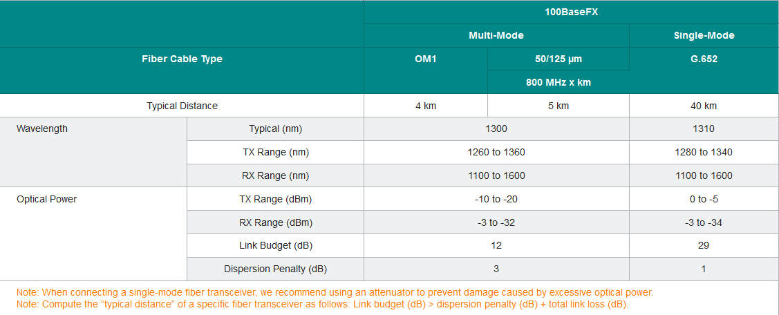 | Dystans transmisji | światłowód wielomodowy: od 0 do 2 km, 1310 nm (62.5/125) światłowód jednomodowy: od 0 do 40 km, 1310 nm (9/125) |
