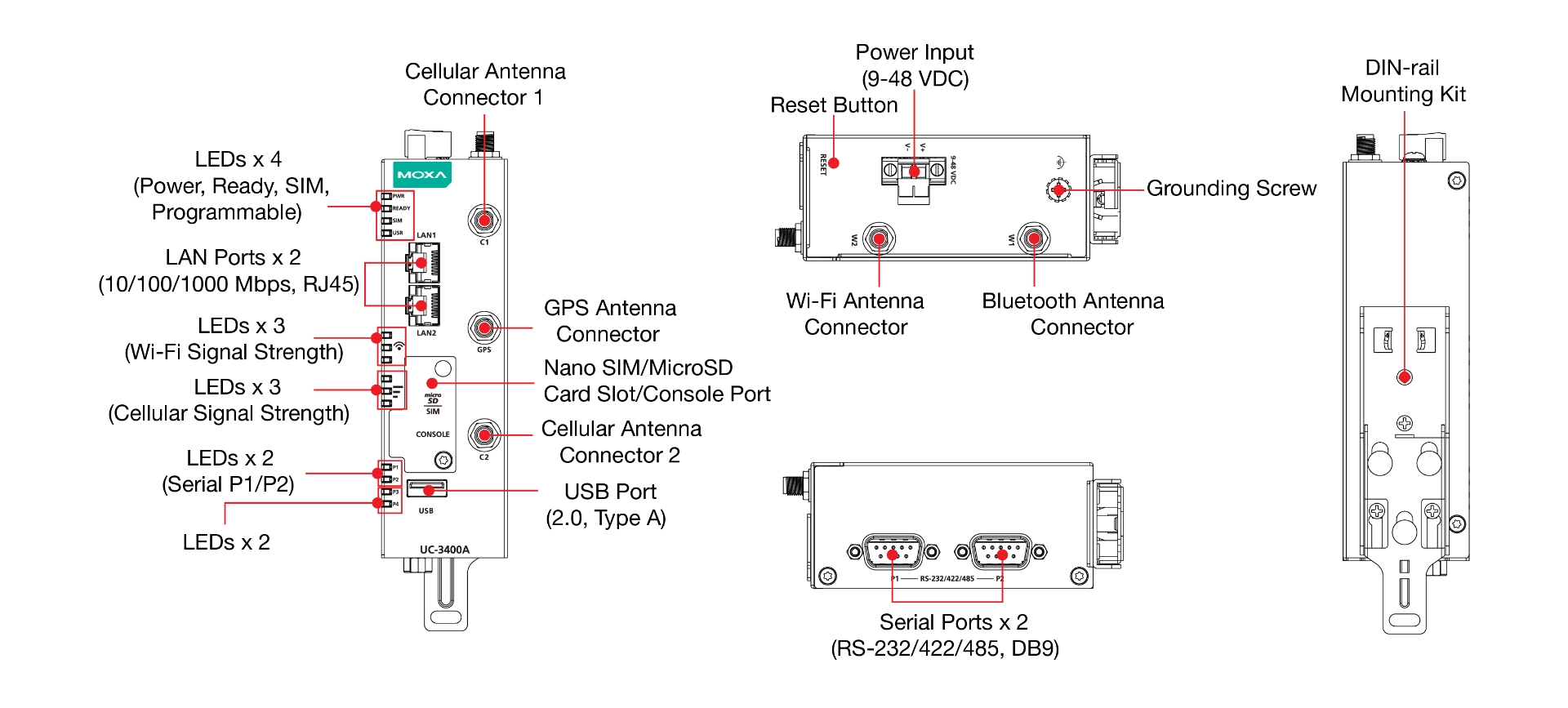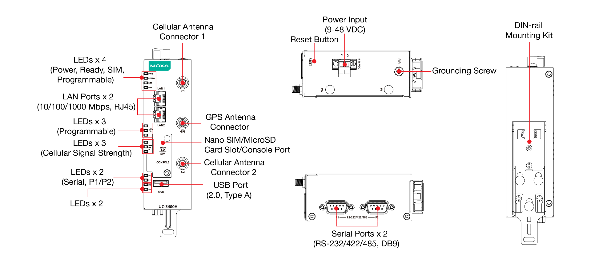| Liczba portów | UC‑3424A‑T‑LTE, UC‑3434A‑T‑LTE‑WiFi: 2 |