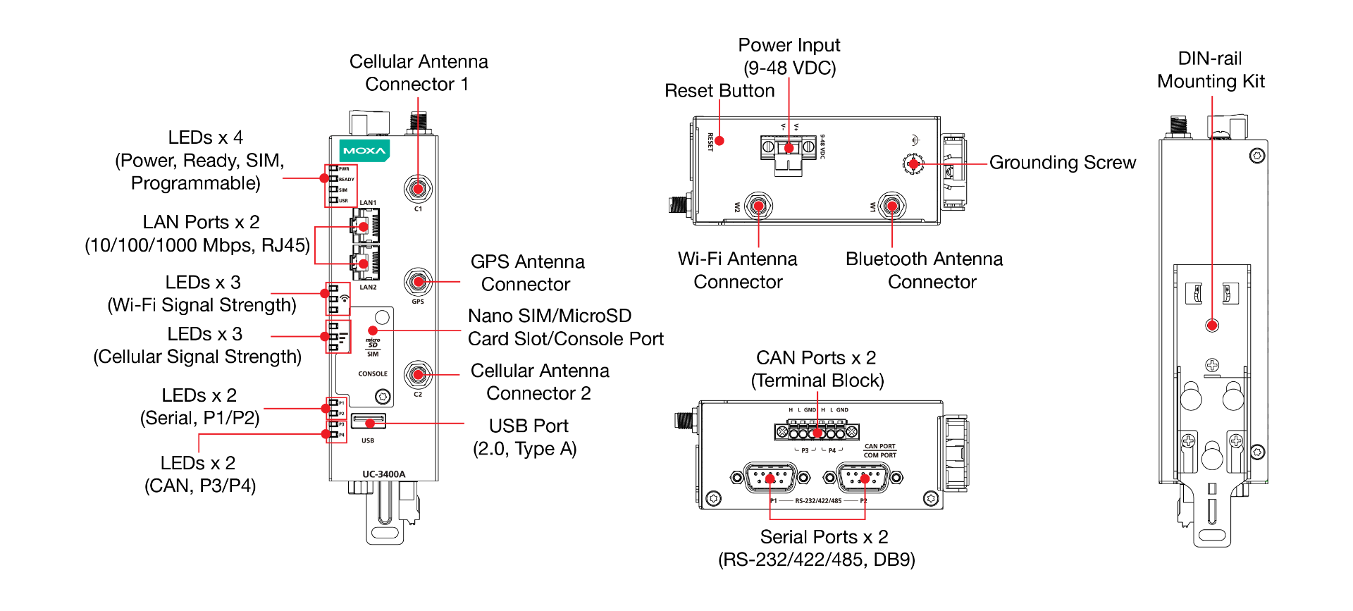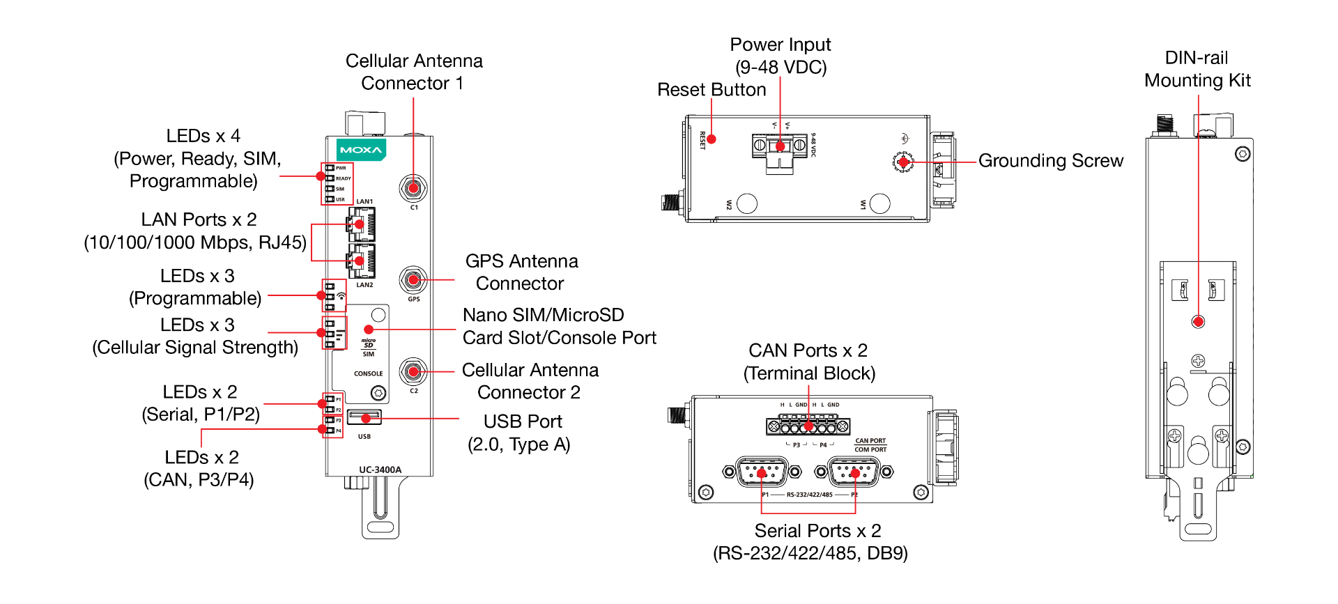 | Porty CAN | UC‑3424A‑T‑LTE, UC‑3434A‑T‑LTE‑WiFi: CAN 2.0 A/B × 2 (DB9 męski) |