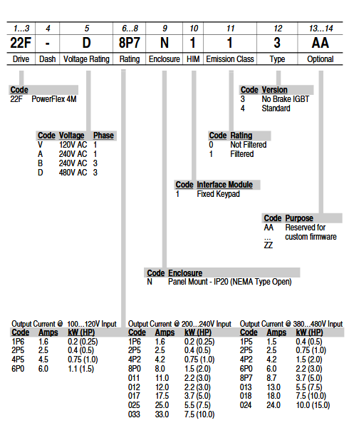 Aby poprawnie zidentyfikować model przemiennika częstotliwości PowerFlex 4M skorzystaj z poniższego schematu oznaczeń.