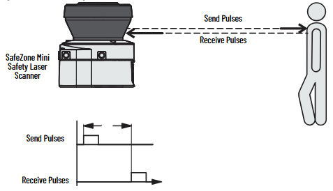 Laserowy skaner bezpieczeństwa SafeZone Mini działa na zasadzie pomiaru czasu przelotu. Urządzenie wysyła krótkie impulsy światła podczerwonego, jednocześnie uruchamiany jest elektroniczny stoper. Gdy światło dotrze do obiektu, odbija się i jest odbierane przez laserowy skaner bezpieczeństwa. Na podstawie czasu pomiędzy wysłaniem i odbiorem sygnału (Δt) laserowy skaner bezpieczeństwa SafeZone Mini oblicza odległość do obiektu.