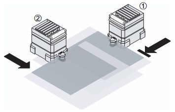 Gdy pojazd ② osiąga pole ostrzegawcze pojazdu ①, pojazd ① zmniejsza prędkość. W momencie, gdy pojazd ② wchodzi w ochronne pole bezpieczeństwa pojazdu ①, pojazd ① zatrzymuje się.