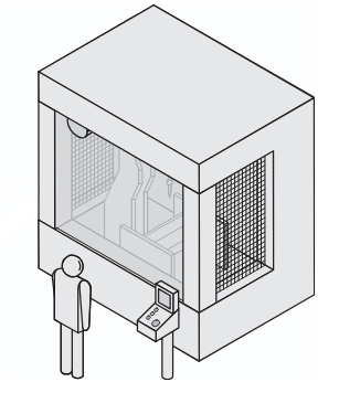 Na niebezpiecznych maszynach stacjonarnych skaner laserowy bezpieczeństwa SafeZone przełącza urządzenia wyjściowe (OSSD) w stan wyłączenia w przypadku naruszenia ochronnego pola bezpieczeństwa. Skaner laserowy SafeZone inicjuje zatrzymanie maszyny lub wyłączenie stanu niebezpiecznego.