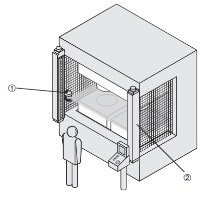 Na dużych maszynach skaner laserowy SafeZone ① może być stosowany do ochrony wnętrza. Uruchomienie maszyny jest możliwe wyłącznie wtedy, gdy skaner nie wykryje żadnego obiektu w polu bezpieczeństwa. Rozwiązanie ma znaczenie w przypadku wnętrz trudno widocznych z zewnątrz. W takiej aplikacji skaner pełni funkcję ochrony wtórnej, natomiast kurtyna świetlna ② zatrzymuje ruch niebezpieczny.