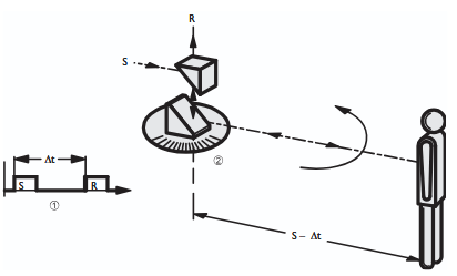 Skaner laserowy bezpieczeństwa SafeZone działa na zasadzie pomiaru czasu przelotu ①. Wysyłane są bardzo krótkie impulsy światła podczerwonego (S). Jednocześnie uruchamiany jest „elektroniczny stoper”. Gdy światło odbija się od obiektu, jest odbierane przez skaner laserowy bezpieczeństwa (E). Na podstawie czasu między wysłaniem a odbiorem (Δt) skaner laserowy bezpieczeństwa SafeZone multizone oblicza odległość do obiektu.